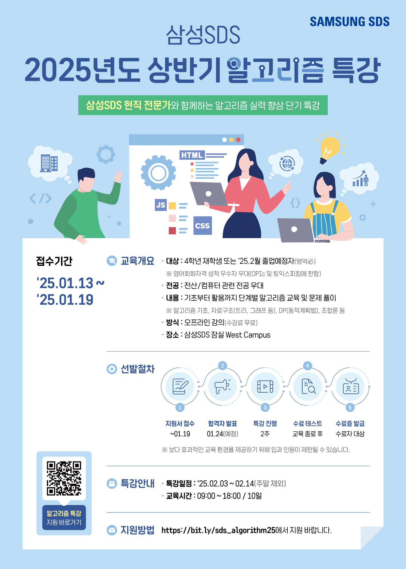 이번 상반기에 진행했던 삼성SDS에서 주관하는 대학생 알고리즘 특강에 참여했다. 평소 알고리즘 공부를 소홀히 한 탓인지 항상 코딩테스트에서 좌절했었다. 혼자서 알고리즘을 준비하니 뭔가 체계가 안잡히는 느낌이 들었고 운이 좋게도 학교 에타에서 해당 공고을 발견하게 되어 망설임 없이 바로 지원하였다.