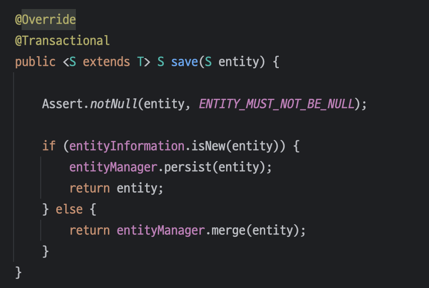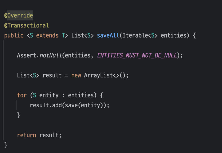 JPA의 구현체인 SimpleJpaRepository에서 그 답을 찾을 수 있다. 먼저 save() 메서드와 saveAll() 메서드에 대한 구현은 아래와 같다.