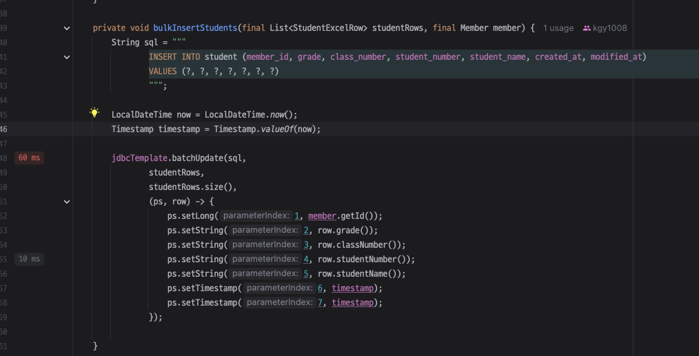 이 코드를 JDBC Template를 통해 단건의 Bulk Insert로 리팩토링 한 결과, 실행시간이 60ms까지 최적화 된 것을 확인할 수 있었다.