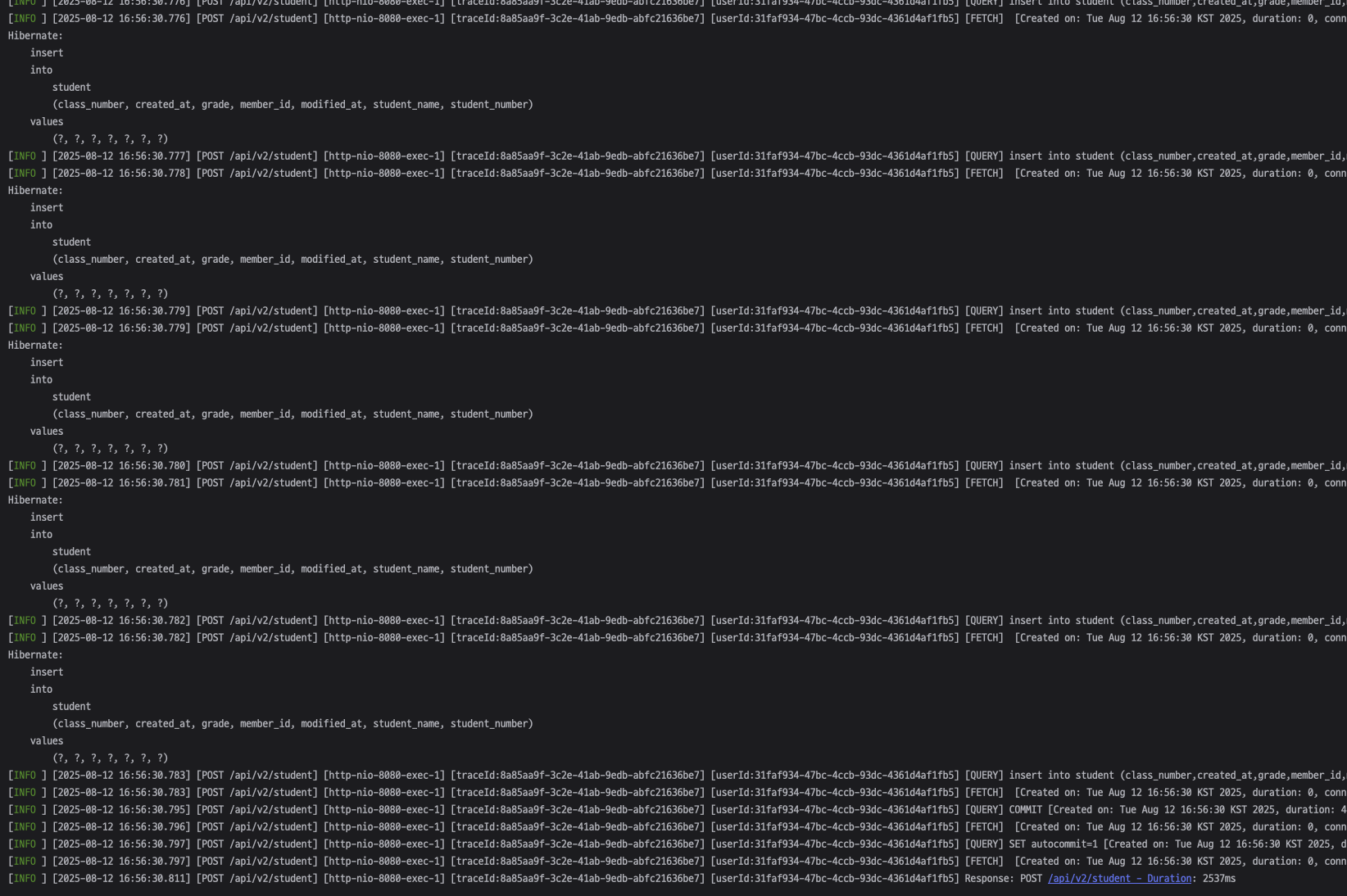 이처럼 여러 개의 데이터를 각각 insert로 실행하면 네트워크 왕복 횟수가 데이터 개수만큼 증가하게 된다. 이 과정에서 불필요한 통신 비용이 발생하고, 대량 데이터를 다룰 경우 응답 속도가 느려지는 문제가 생긴다.