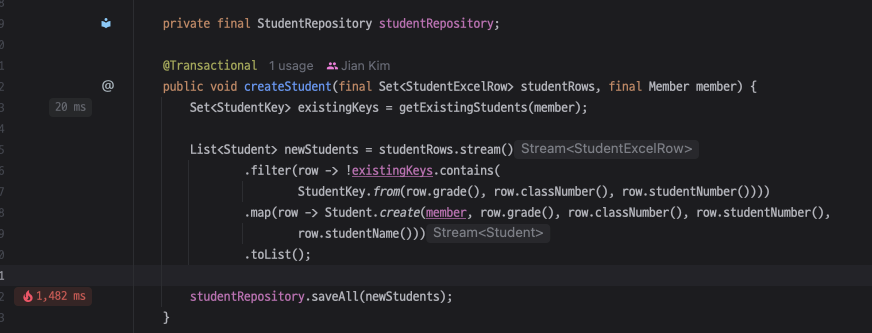 실제로 saveAll() 메서드를 통해 다량의 데이터를 삽입했을 때, 실행 시간을 측정해보면 그 시간이 무려 1000ms가 넘게 측정되었다.