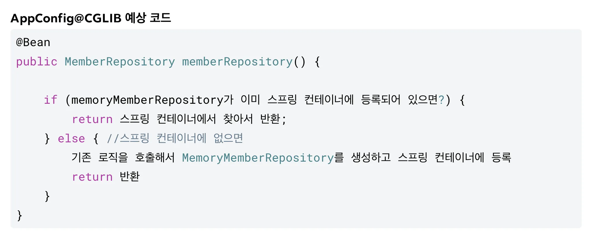 CGLIB의 내부 기술은 매우 복잡하지만, 간단하게 살펴보면 위의 코드처럼 @Bean이 붙은 메서드마다 이미 스프링 빈이 존재하면 존재하는 빈을 반환하고, 스프링 빈이 없으면 생성해서 스프링 빈으로 등록하고 반환하는 코드가 동적으로 만들어지는 것이다. 이러한 기술로 인해 싱글톤이 보장된다.