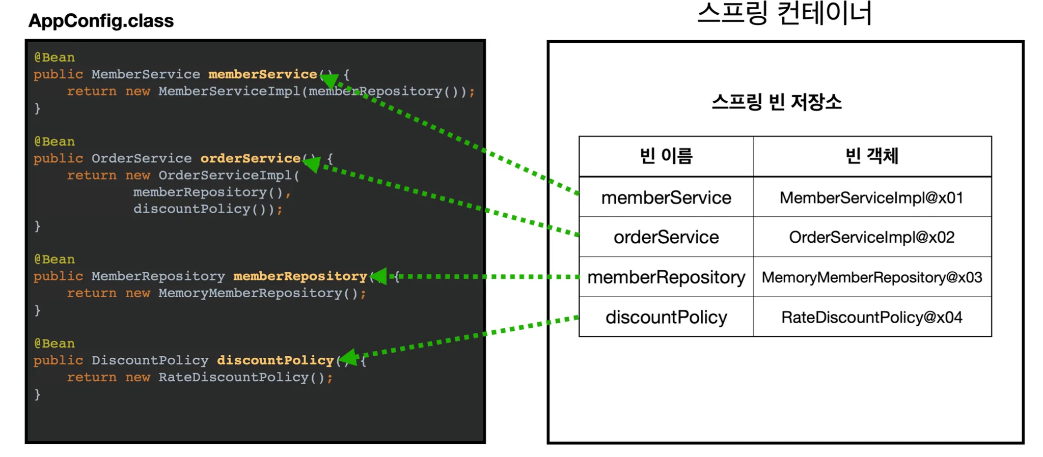 스프링 컨테이너는 파라미터로 넘어온 설정 클래스 정보를 사용해서 스프링 빈을 등록한다. 여기서 주의해야 할 점은 빈 이름은 고유해야 한다는 것이다. 즉, 항상 다른 이름을 부여해야 한다.