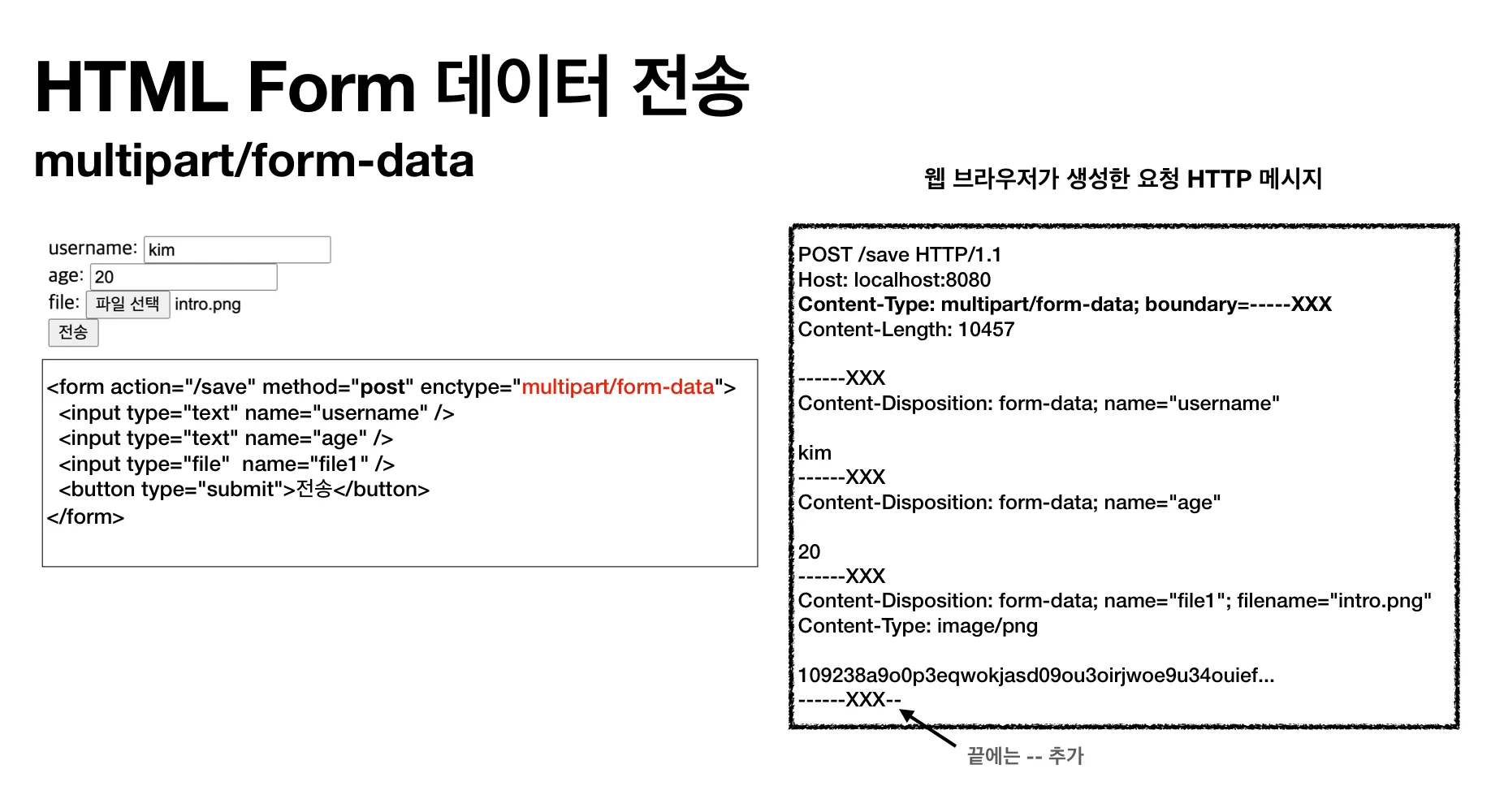 파일을 업로드하기 위해서는 문자가 아닌, 바이너리 데이터를 전송해야 한다. 이때, 만약 문자열인 이름과 숫자인 나이 그리고 파일을 함께 전송한다면, 문자와 바이너리를 동시에 전송해야 하는 문제가 발생하게 된다. 이를 해결하기 위해 HTTP는 mutipart/form-data라는 전송 방식을 제공한다.