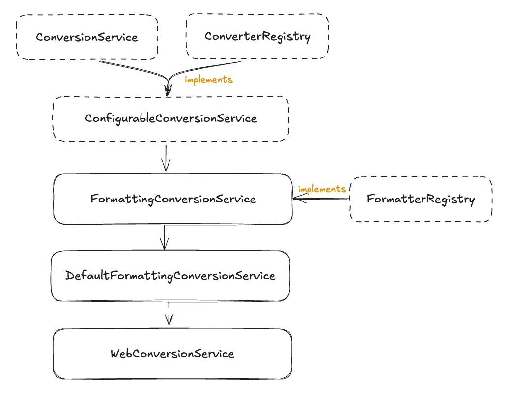상속 구조를 위로 타고 올라가보면, FormattingConversionService는 ConvertRegistry인터페이스와 FormatterRegistry의 구현체이다. 그리고 DefaultFormattingConversionService는 FormattingConversionService를 상속받은 자식 객체이기 때문에 Formatter와 Converter 모두 지원하는 ConversionService인 것이다. 추가로 스프링 부트는 DefaultFormattingConversionService를 상속받은 WevConversionService를 ConversionService로 내부에서 사용한다. 따라서, 스프링 부트 환경에서는 기본적으로 컨버터와 포맷터를 모두 지원하는 ConversionService가 자동으로 활성화된다.