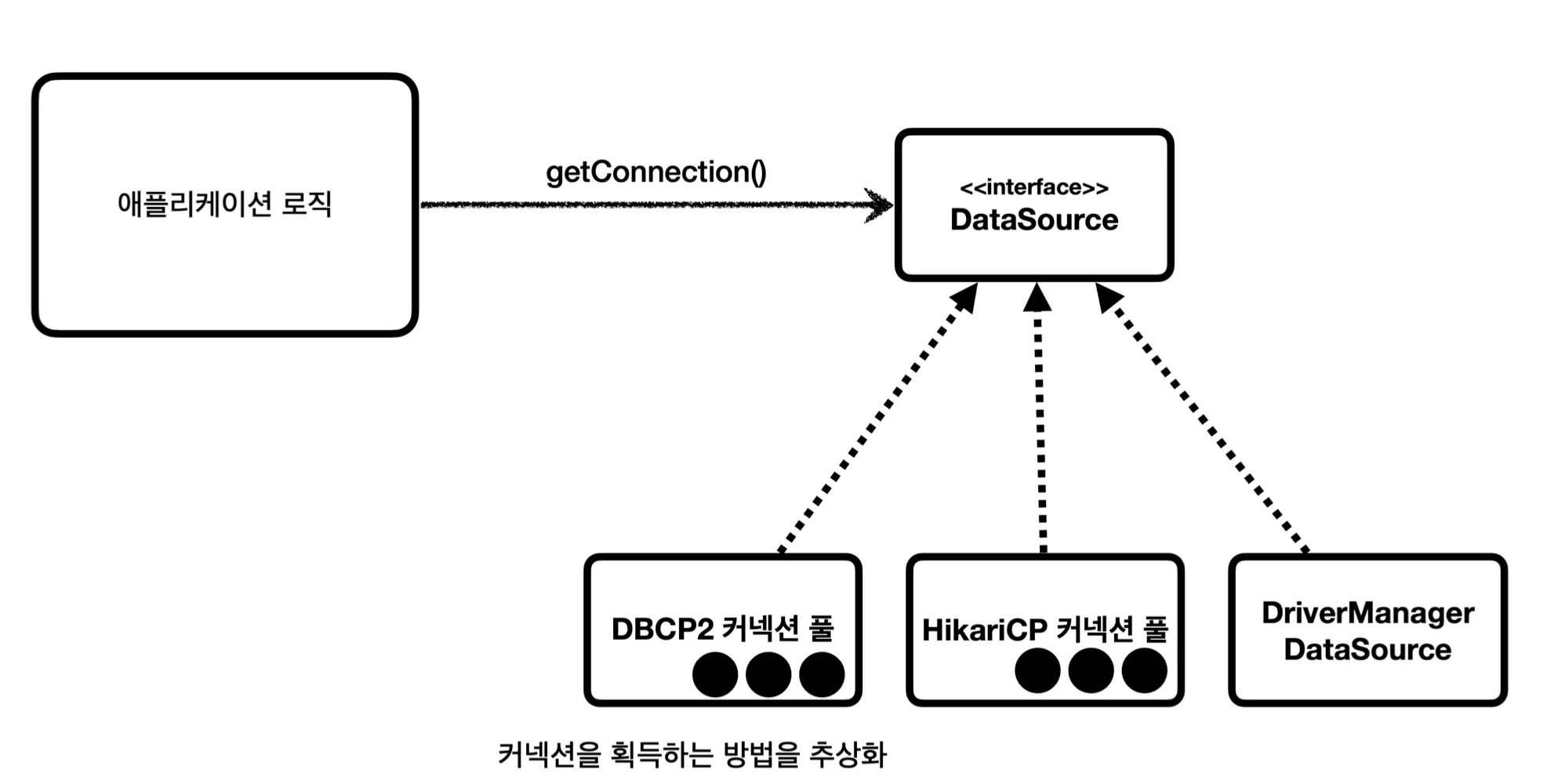 DataSource는 커넥션을 획득하는 방법을 추상화한 인터페이스이다. 이런 인터페이스를 선언함으로써, JDBC의 DriverMangerDataSource를 직접 사용하거나 HikariCP 커넥션 풀을 이용하는 등 커넥션을 획득하기 위한 방법을 변경해도, 로직의 큰 변화 없이 수행할 수 있다. 즉, OCP 원칙을 지킨 설계인 것이다.