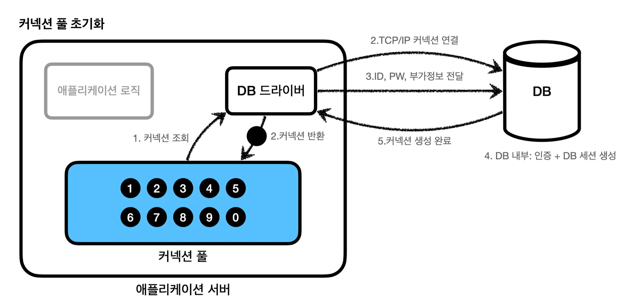 커넥션 풀로 인해, 애플리케이션 로직에서는 DB 드라이버를 통해 새로운 커넥션을 획득하지 않아도, 커넥션 풀에 이미 생성되어 있는 커넥션을 조회하여 사용하면 되는 것이다. 이렇게 커넥션을 할당받아, 로직을 수행한 후에는 커넥션을 종료하는 것이 아니라, 다음에 다시 사용할 수 있도록 해당 커넥션을 그대로 커넥션 풀에 반환하면 된다. 즉, 모든 로직을 수행한 후, 커넥션을 종료하는 것이 아니라 다음에 다시 사용할 수 있도록 해당 커넥션을 그대로 커넥션 풀에 반환하면 되는 것이다.