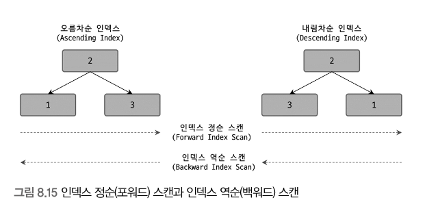 인덱스 생성 시점에 오름차순 또는 내림차순으로 정렬이 결정되지만 쿼리가 그 인덱스를 사용하는 시점에 인덱스를 읽는 방향에 따라 오름차순 또는 내림차순 정렬 효과를 얻을 수 있다. 오름차순으로 생성된 인덱스를 정순으로 읽으면 자동으로 오른차순으로 정렬된 결과가 되고, 역순으로 읽으면 그 결과는 내림차순으로 정렬된 상태가 되는 것이다.