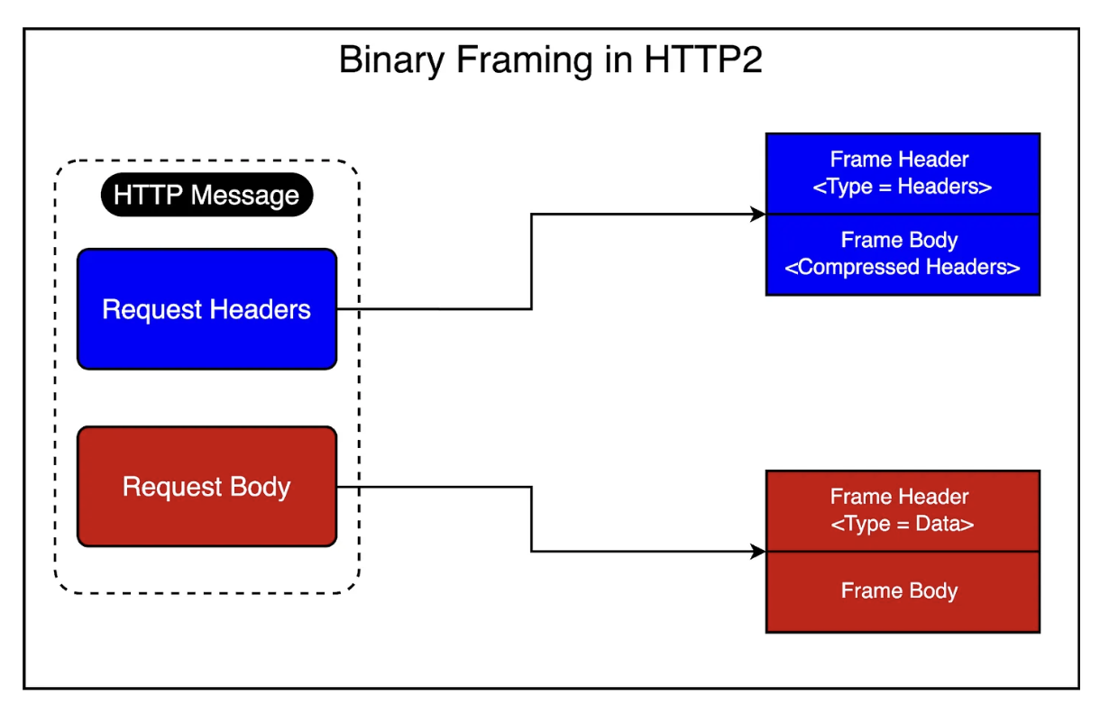 HTTP/2는 HTTP 요청의 데이터와 헤더 섹션을 서로 다른 프레임으로 분리한다. Header 프레임은 콘텐츠 유형, 인코딩 방식, 캐시 지시어 등의 요청 또는 응답에 대한 메타데이터를 담고 있고 Data 프레임은 실제 페이로드나 메시지 내용을 포함하고 있다.