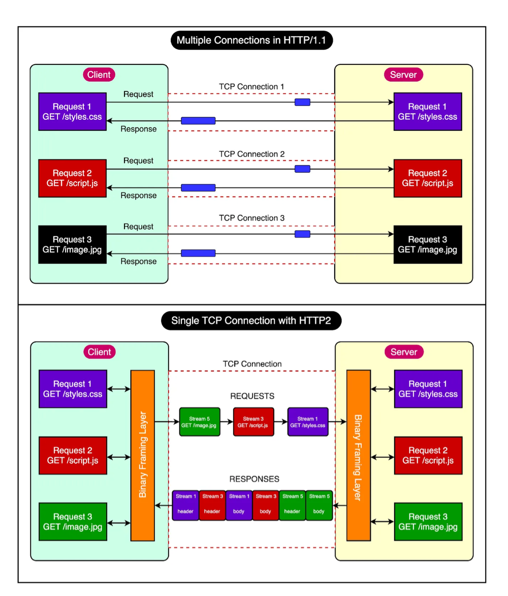 HTTP/2가 HTTP/1과 가장 크게 다른 점 중 하나는, 하나의 TCP 연결 안에서 여러 개의 요청과 응답을 동시에 처리할 수 있다(Multiplexing)는 점이다. 그리고 이것이 가능한 이유가 바로 앞서 설명한 Binary Framing Layer라는 핵심 기술 덕분이다.