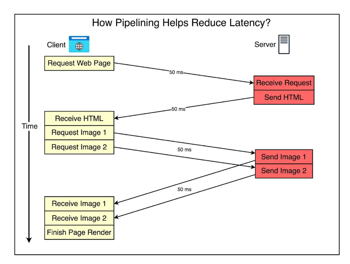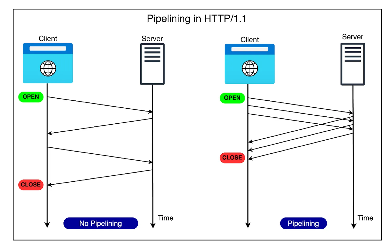 HTTP/1.1에서는 Pipelining이라는 개념도 도입했다. Pipelining이란, 클라이언트가 하나의 TCP 연결을 통해 여러 요청을 각각의 응답을 기다리지 않고 연속해서 보낼 수 있도록 하는 것을 말한다. 쉽게 말해, 하나의 커넥션에서 요청에 대한 응답을 기다리지 않고 순차적인 여러 요청을 연속적으로 보내서 그 순서에 맞춰 응답을 받는 방식이다. 각 요청에 대한 응답을 기다리지 않고 다음 요청을 보낼 수 있도록 하여 지연(Latency)을 줄임으로써 성능을 향상시켰다. 하지만 Pipelining에도 head-of-line blocking(HOL)라는 한계가 존재한다.