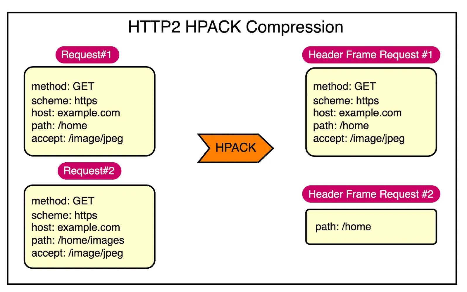 위 사진을 보면 요청1과 요청2의 대부분의 필드들이 같은 값을 가지고 있다. HTTP/2는 HPACK을 이용해, 이미 전송한 공통된 필드 값들은 인덱스로 참조하고, 달라진 path 필드만 새로 인코딩해서 전송함으로써 전체 헤더 크기를 줄인다.