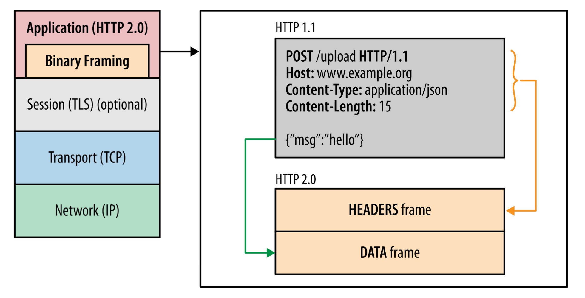 HTTP 2에서는 애플리케이션 계층과 전송 계층 사이에 바이너리 포맷 계층을 추가하여 HTTP 메시지를 바이너리 형식으로 바꾸고, 이를 프레임 단위로 쪼개어 동시에 여러 요청을 병렬로 처리할 수 있게 되었다. 바이너리 형식을 사용함으로써 효율성 뿐만 아니라 공백, 대소문자, 줄바꿈 처리 등에 여러 "helpers"가 필요했던 HTTP/1에 비해 오류 가능성이 낮아졌다.
