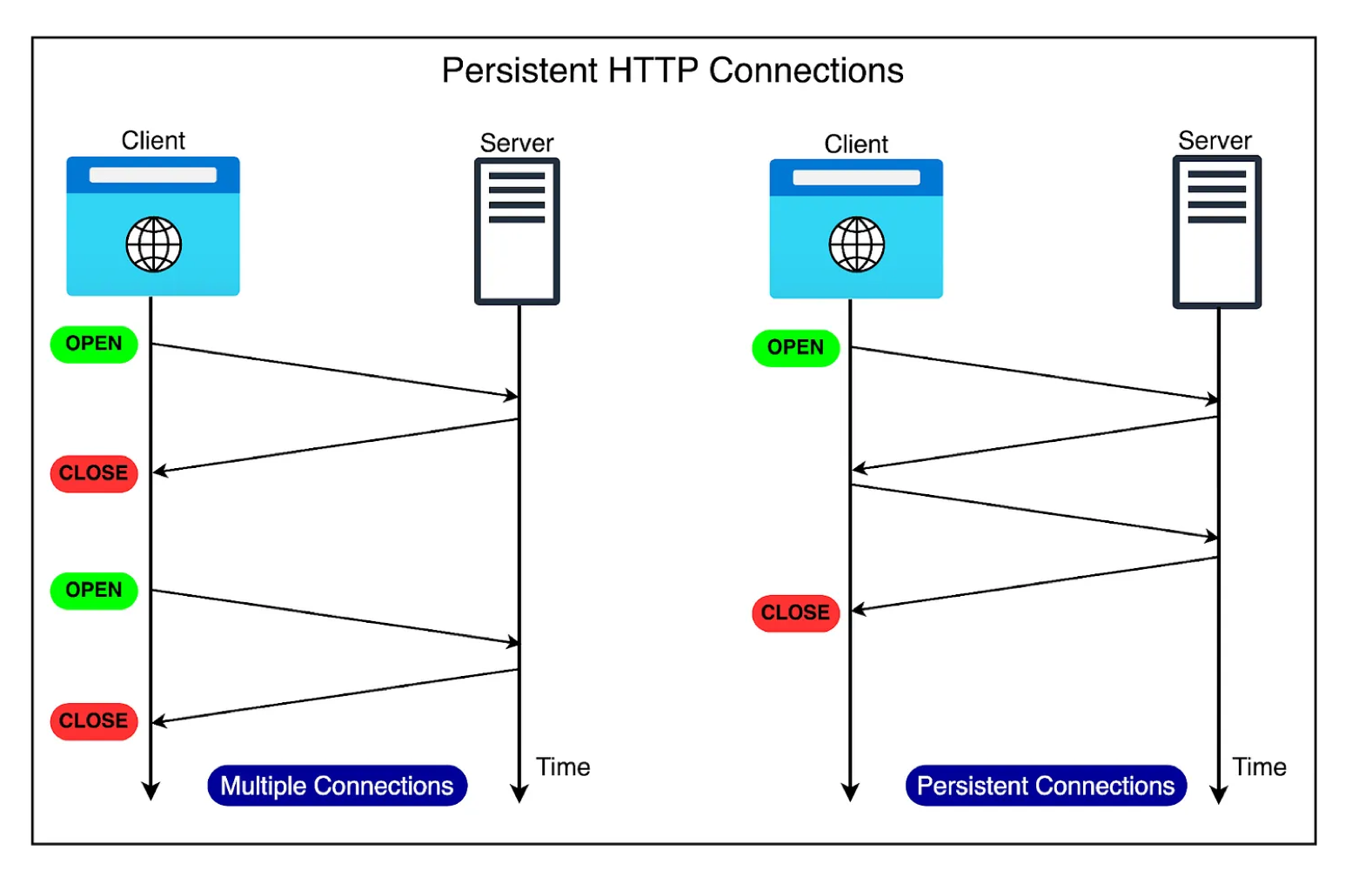 HTTP/1.1은 지속 연결(persistent connections)을 지원함으로써 이러한 오버헤드를 제거했다. TCP 연결을 닫으라는 특별한 요구가 없는 한 연결은 계속 유지된다. 그 결과, HTTP/1.1에서는 요청마다 연결을 끊을 필요가 없고, TCP 핸드셰이크도 여러 번 수행할 필요가 없게 되었다