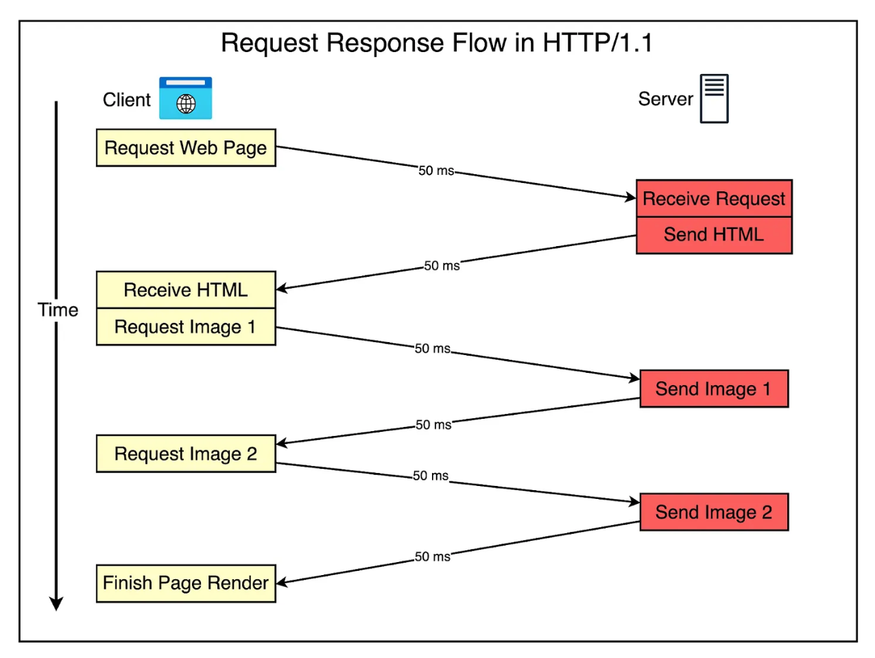 위 사진을 흐름을 파악해보자. 브라우저가 먼저 HTML 파일을 받은 뒤, 첫 번째 이미지를 요청한다. 이 요청에는 100ms의 지연이 발생한다. 이후 두 번째 이미지 요청이 이어지고, 다시 100ms의 지연이 발생한다. 결국 모든 리소스를 순차적으로 요청하고 받아와야 하므로, 브라우저는 모든 파일을 다 받아야만 페이지 렌더링을 완료할 수 있다. 이처럼 웹페이지에 포함된 리소스(이미지, 스크립트 등)가 많아질수록 왕복 지연 시간(RTT)이 누적되어 전체 페이지 로딩 속도가 느려지는 문제가 발생한다.