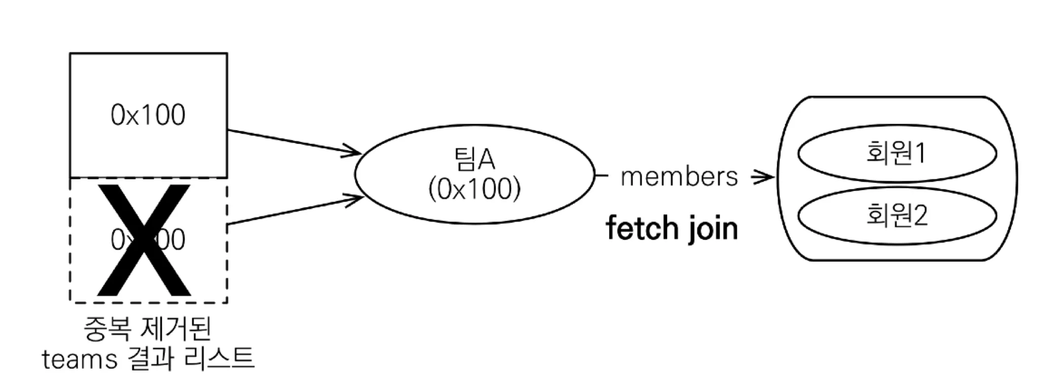 Team과 Member 엔티티를 조인했을 때, Team 관점에서 보면 데이터가 중복 생성되었다. 즉, 팀A인 데이터가 여러개 존재한다. 특히, 영속성 컨텍스트는 PK값을 기준으로 데이터를 관리하기 때문에 첫 번째 데이터와 두 번째 데이터는 영속성 컨텍스트 내에서는 같은 값으로 인식된다.