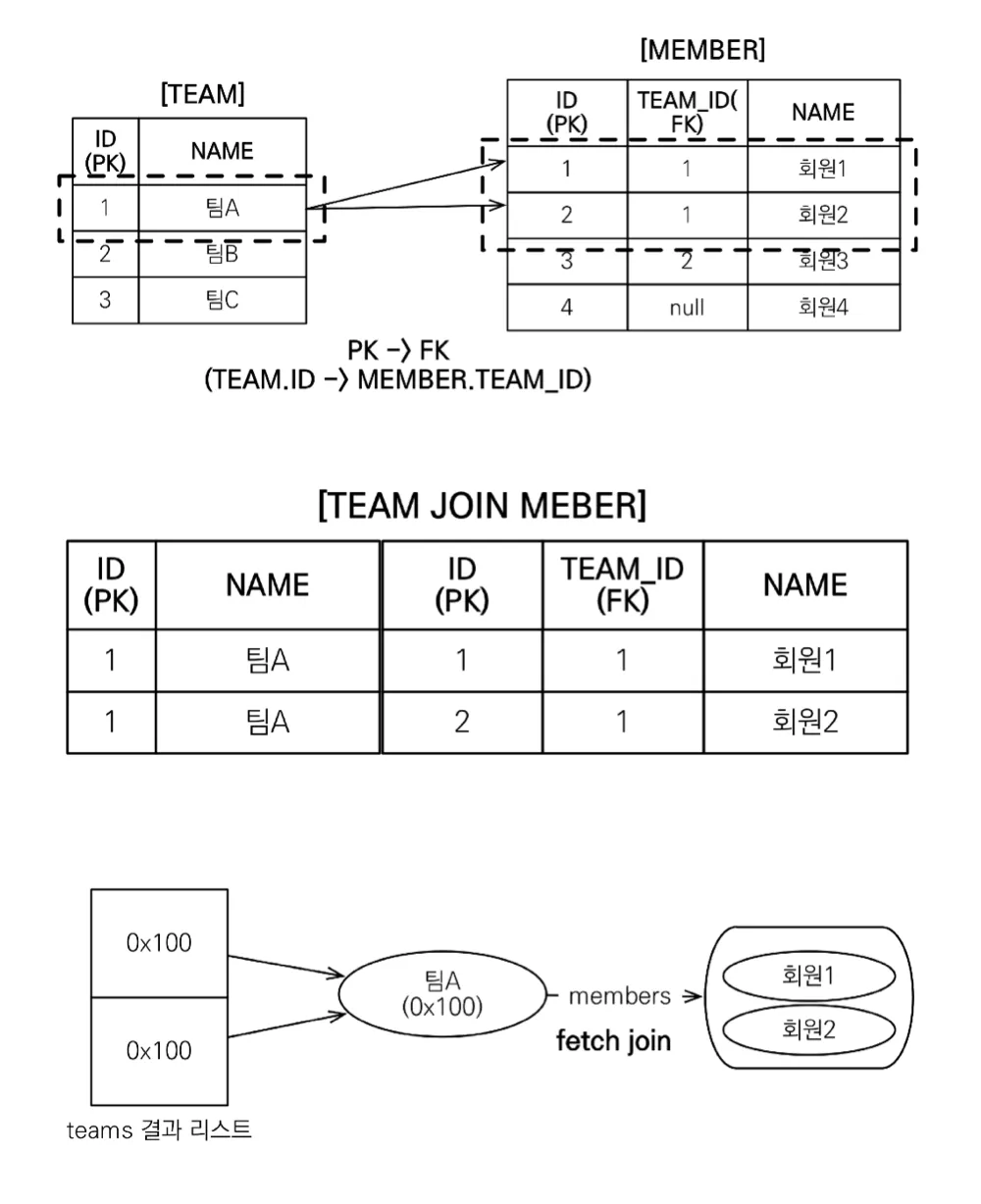 위의 JPQL문에서는 Member 엔티티만을 select한다고 작성하였지만 join fetch를 함으로써 실제 SQL문은 Member와 Team 테이블을 모두 조회하는 쿼리가 나가게 된다. 이처럼 페치 조인을 사용하면 연관된 엔티티를 함께 조회할 수 있다.