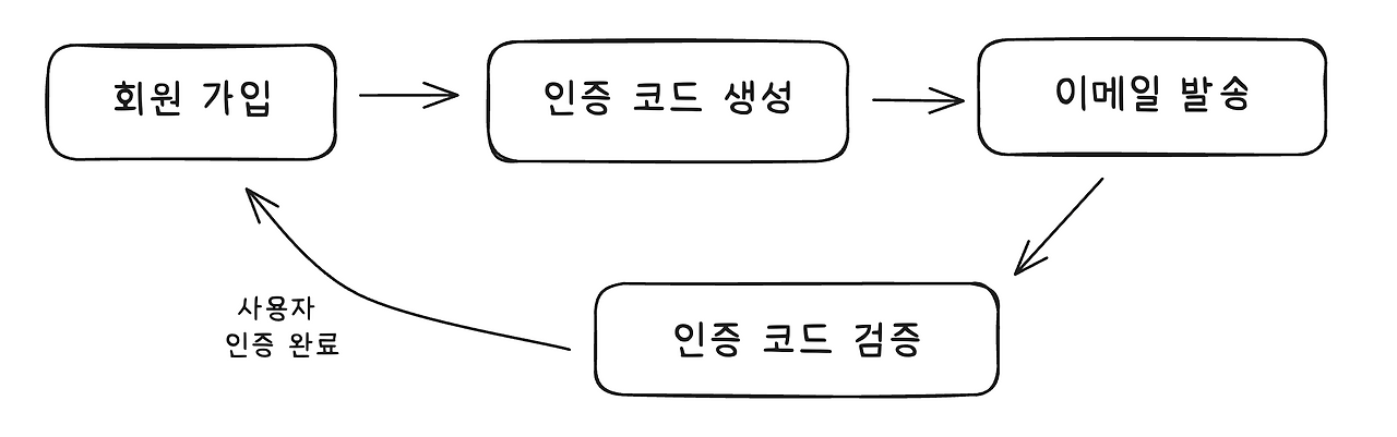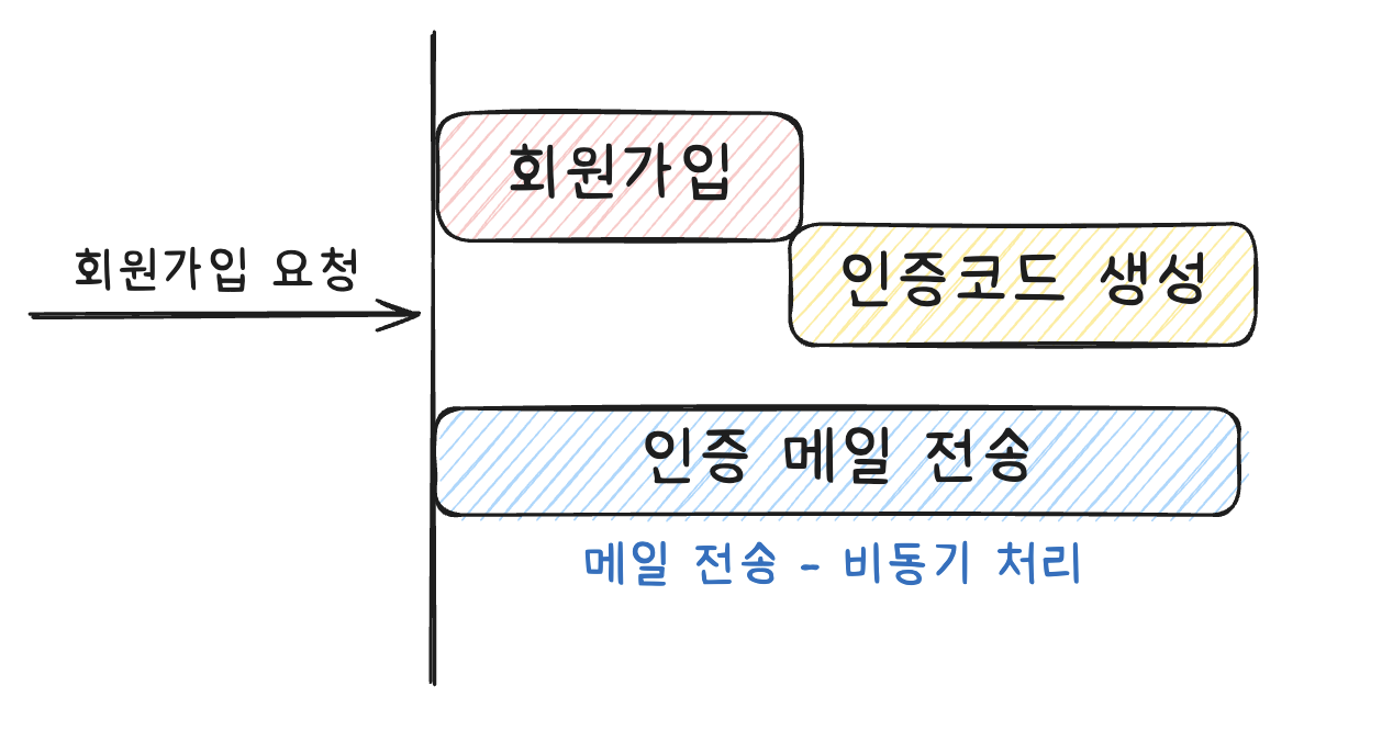 회원가입 API에서는 회원 정보를 저장하고 인증 코드를 생성한 뒤, 회원가입이 완료되었음을 알리는 이벤트를 발행한다. 이후 API는 곧바로 클라이언트에게 회원 가입이 완료되었다는 성공 응답을 반환한다.