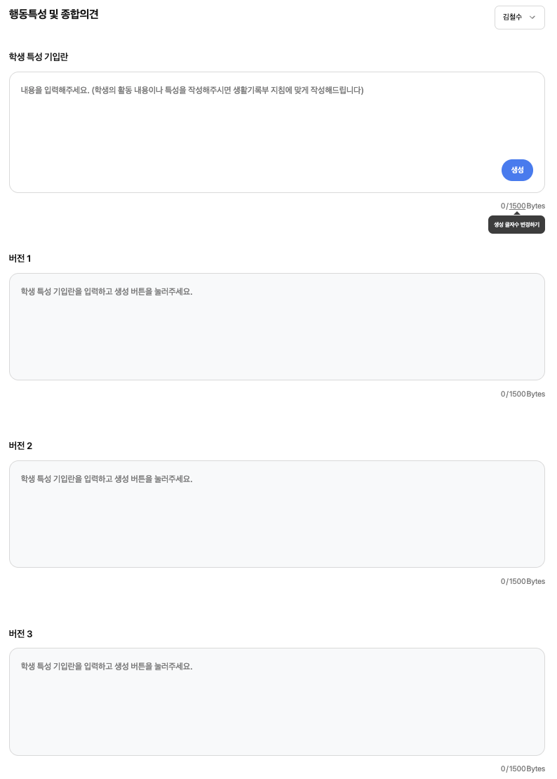 우리 서비스는 위와 같이 각 생기부 작성 항목 별로 학생의 특성을 입력하고 생성 버튼을 누르면 3가지 버전의 AI 생성 응답 값을 제공하고 있다.