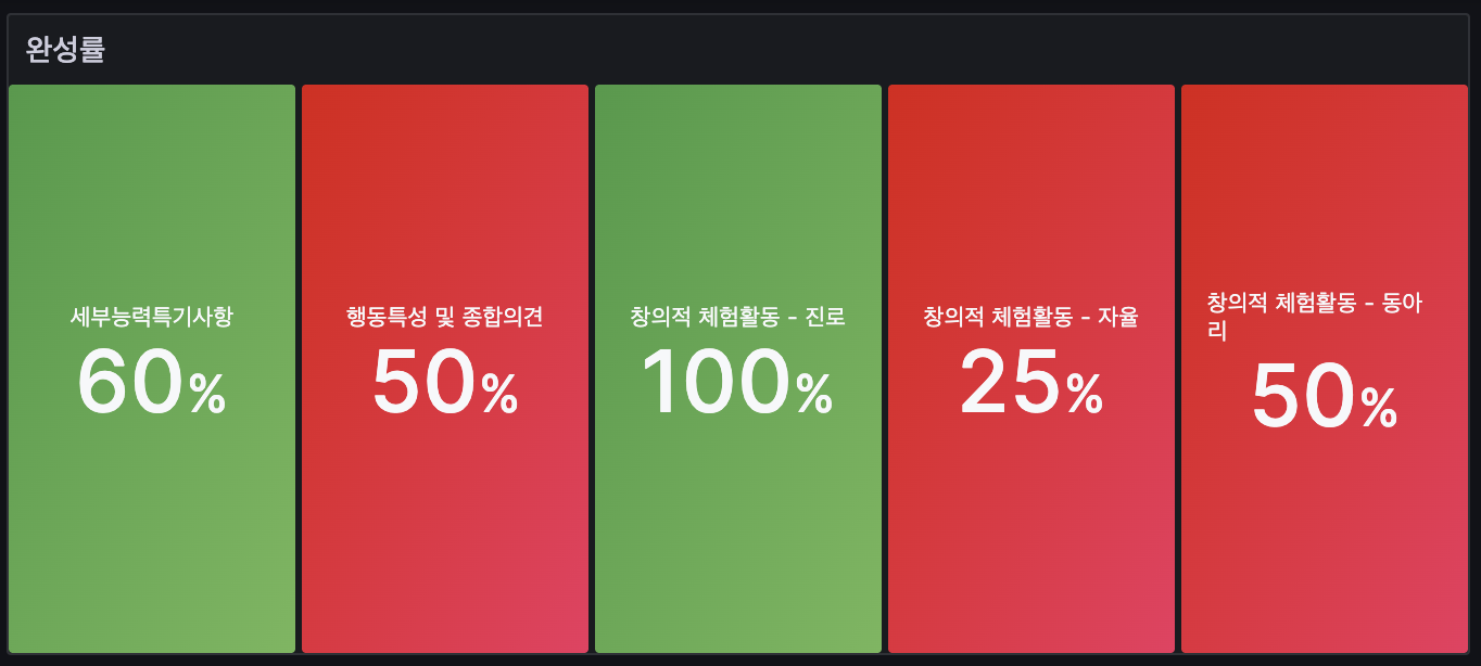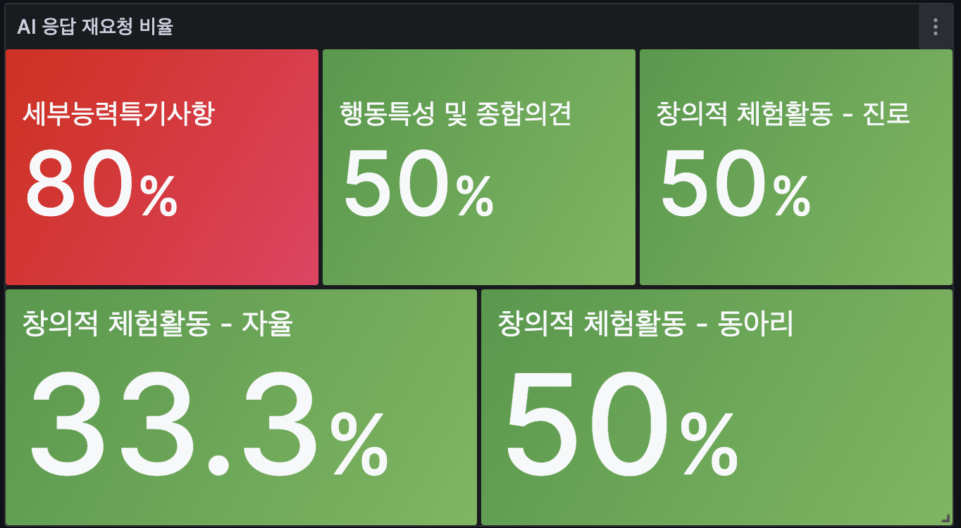 여기서 student_record_ai_generation_requests_total은 AI가 생성 요청을 받은 횟수이고, student_record_completion_total은 실제로 데이터베이스에 최종본을 저장한 횟수다. 예를 들어 AI 생성 요청이 총 100번 있었고, 그 중 70번은 사용자가 유요한 저장을 시도했으면 응답 완성률은 70%인 것이다.