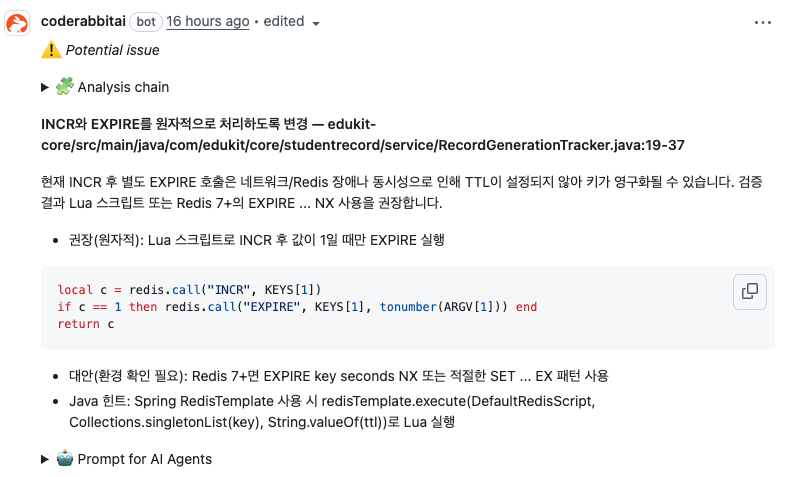 하지만, 이렇게 PR을 올라고 보니 CodeRabbit이 아래와 같은 리뷰를 남겨주었다.