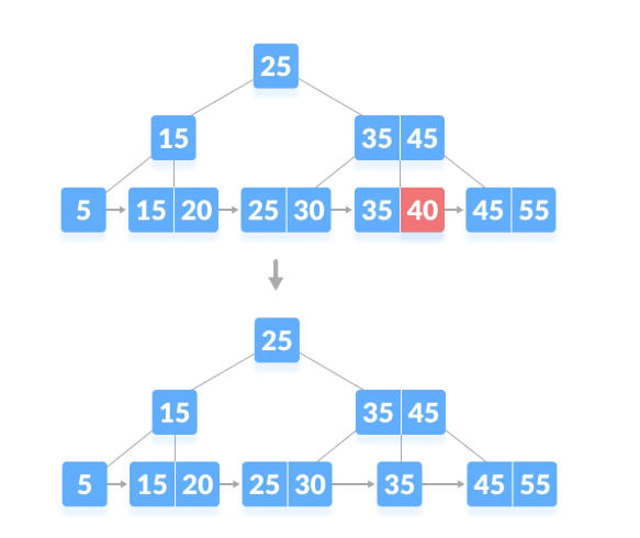 리프 노드에 존재하는 값인 40을 삭제한 후에도 최소 개수 조건을 만족하므로 재조정이 일어나지 않는다.