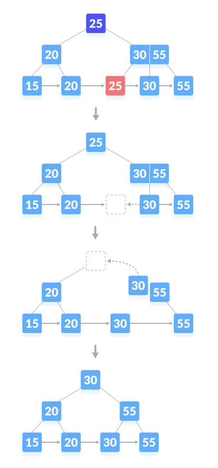 정리하면, 삭제된 키가 내부 노드의 인덱스였을 경우, 그 인덱스는 해당 리프 노드의 새로운 최소값으로 교체된다. 만약 해당 리프 노드가 완전히 비거나 병합되는 상황이라면, 인접 리프 노드의 최소값이 새로운 인덱스로 사용된다.
