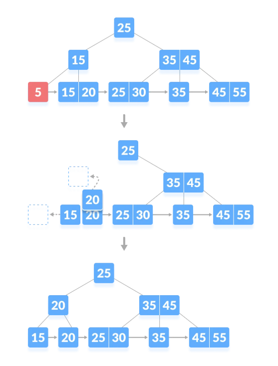 B+ Tree에서 값을 삭제할 때는 항상 최소 개수 조건을 만족해야 한다. 그러나 예를 들어 값 5를 삭제하는 순간 해당 노드가 최소 개수 조건을 만족하지 못한다면 트리의 균형을 유지하기 위해 재조정이 이루어진다. 각 노드가 가져야 하는 최소 Key의 개수는, 노드의 최대 자식 수를 M이라고 했을 때 ⌈M/2⌉ - 1로 정의된다.