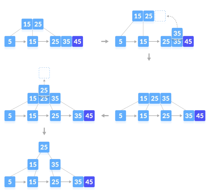 예를 들어 값 45를 삽입한다고 가정해 보자. 루트 노드에 15, 25가 저장되어 있다면, 45는 이보다 큰 값이므로 가장 오른쪽 자식 노드로 내려간다. 그러나 이 노드에 삽입할 경우 노드가 넘치게 되므로, 가운데 Key인 35를 부모 노드로 승격시킨다. 이때 35가 루트로 올라가면서 루트 노드 역시 넘치게 되고, 다시 가운데 Key인 25가 승격된다. 이처럼 삽입 과정에서는 연쇄적인 분할과 승격이 발생할 수 있으며, 이를 통해 트리의 균형이 유지된다.
